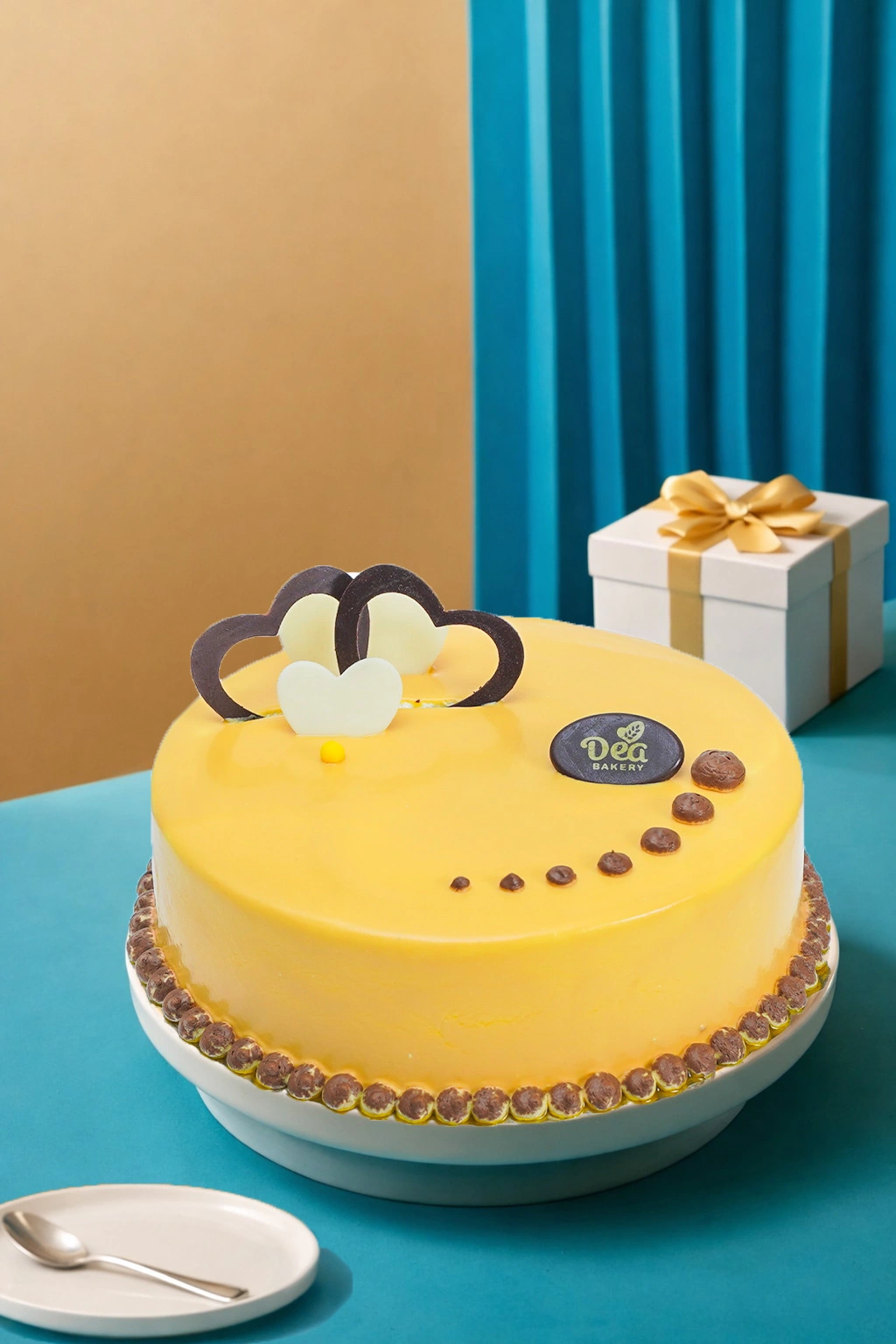 Kue tart dengan base sponge cake coklat dibalut whipping cream vanilla dan glaze susu warna oranye dilengkapi hiasan coklat keping bentuk love rasa vanilla dan coklat