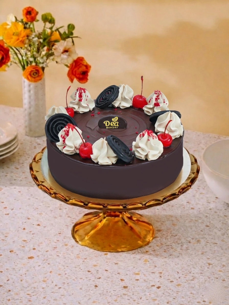 kue tart dengan base sponge cake coklat lembut dibalut whipping cream dan pasta coklat dilengkapi cream rasa kopi, buah cherry, coklat keping circle, dan red velvet crumble