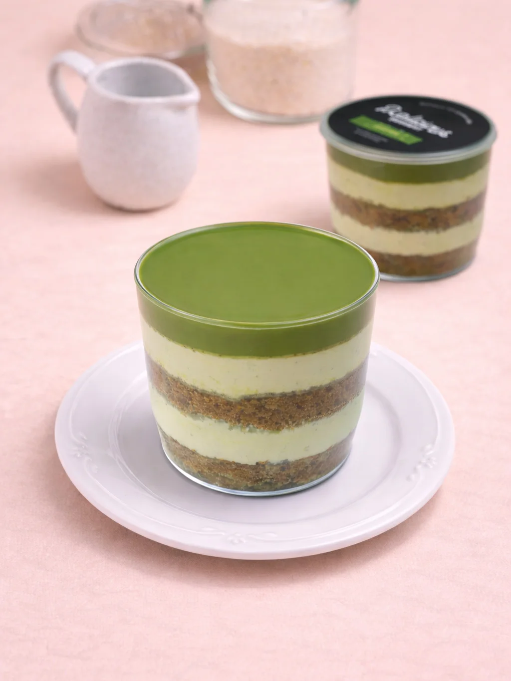 Dessert nikmat yang terdiri dari layer matcha cake, cream matcha, dan matcha ganache