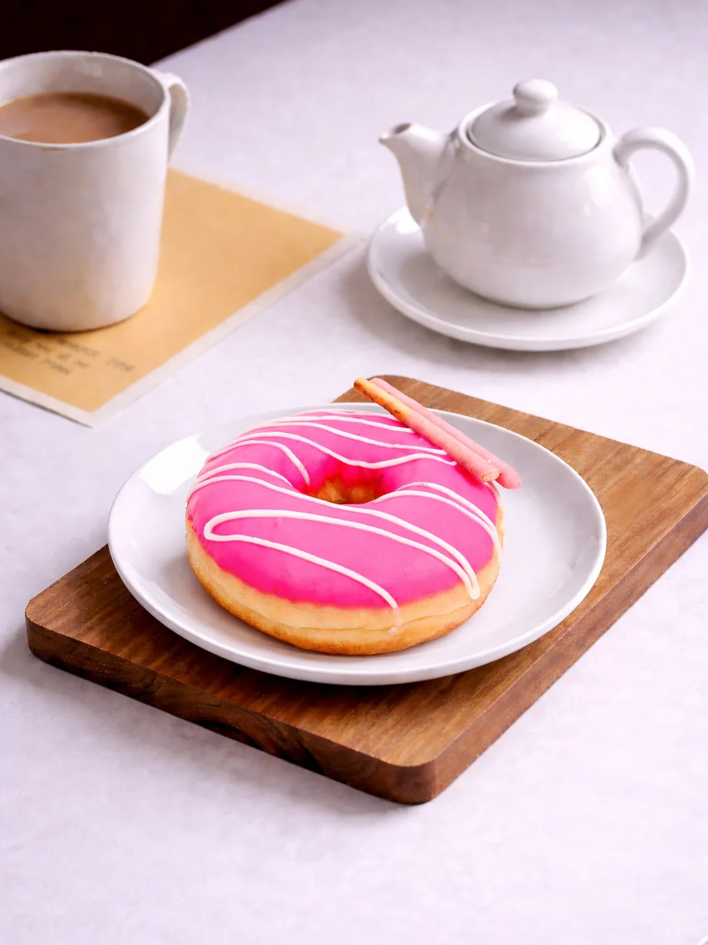 Donat lembut dengan topping glaze strawberry, kiciran coklat putih, dan pocky strawberry