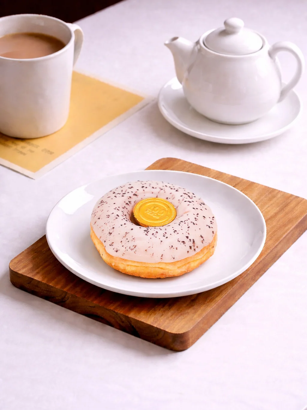Donat lembut dengan topping glaze tiramisu, taburan bubuk coklat, dan coklat koin