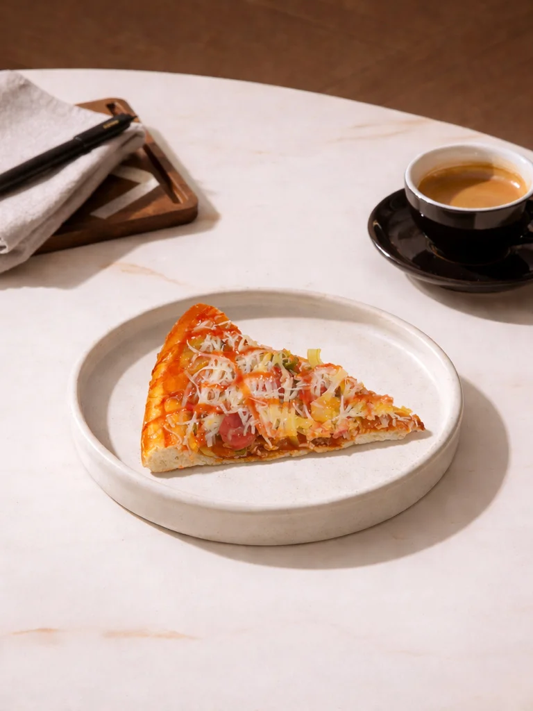 Roti pizza dengan taburan keju parut ditambah taburan sosis dan rempah yang lengkap