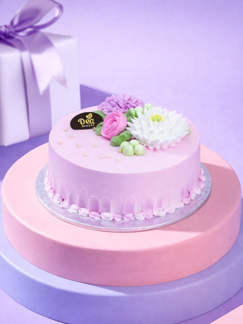 kue tart dengan base sponge cake coklat lembut dibalut whipping cream pink lembut, dilengkapi dengan dekorasi berbentuk bunga krisan putih yang cantik.